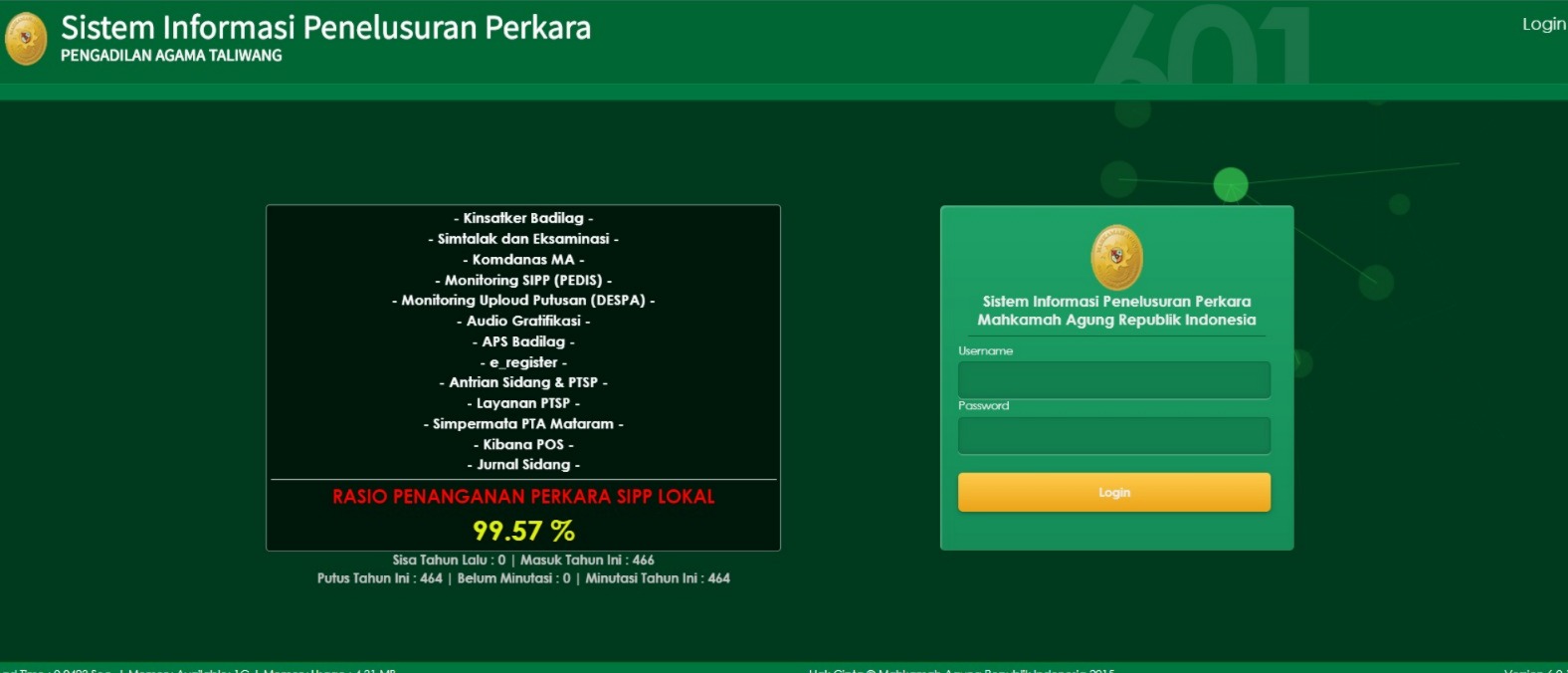 Taliwang, 31 Desember 2025 — Pengadilan Agama Taliwang mencatatkan capaian kinerja yang sangat optimal dalam penyelesaian perkara sepanjang Tahun 2025. Berdasarkan data akhir tahun, dari total 466 perkara yang terdaftar, sebanyak 464 perkara telah berhasil diselesaikan, sehingga tingkat penyelesaian perkara mencapai 99,57 persen.