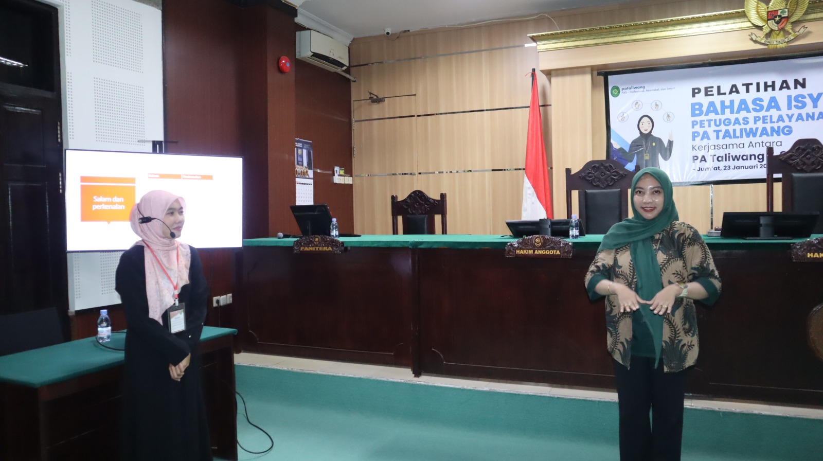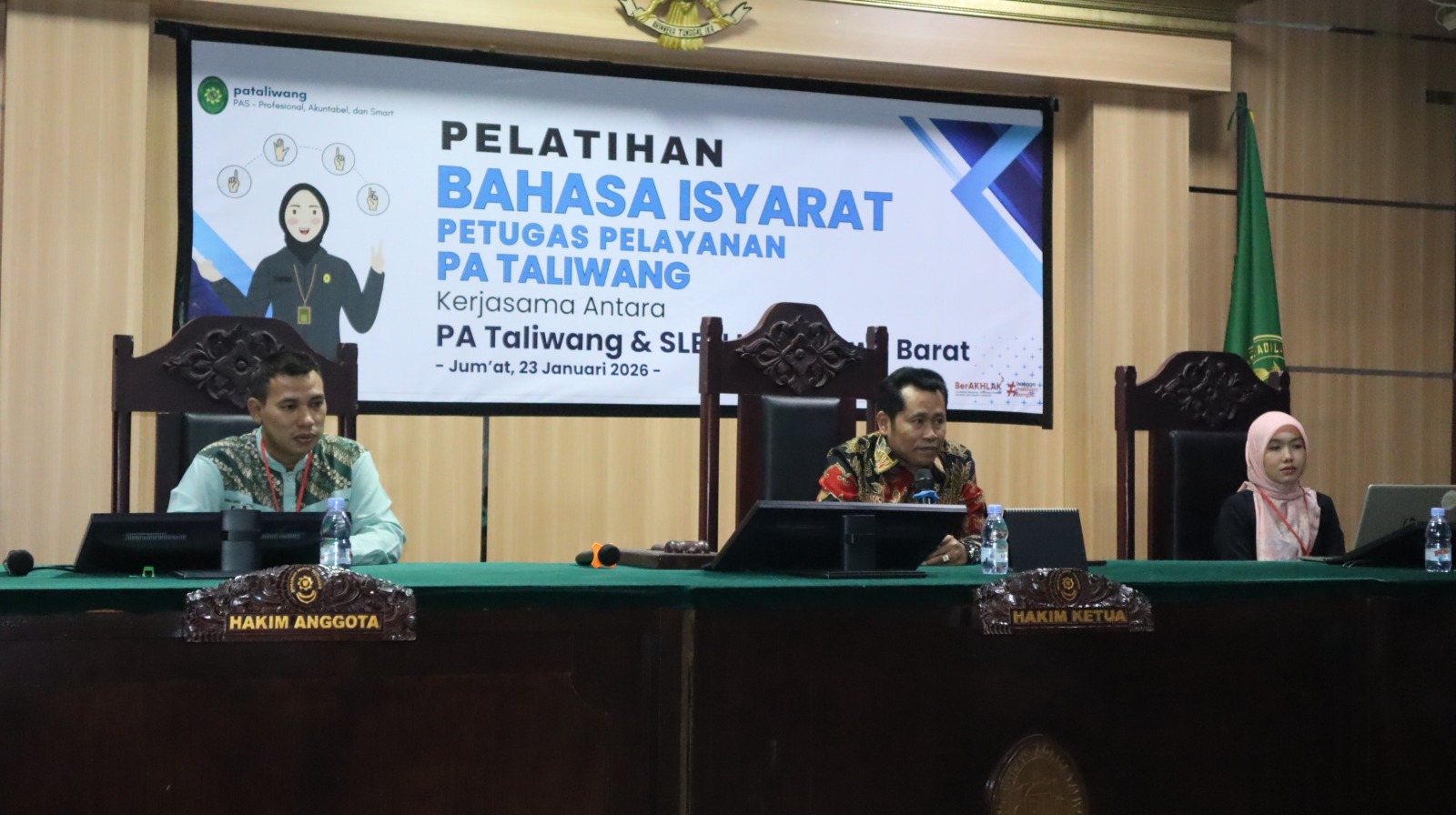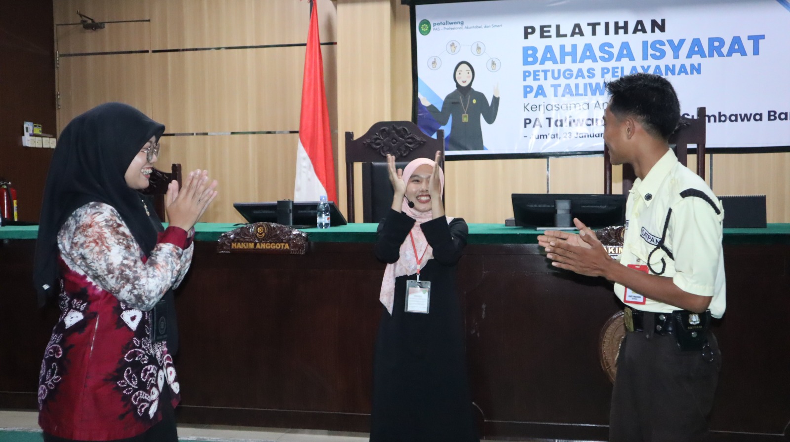 Taliwang – Pengadilan Agama Taliwang menyelenggarakan Pelatihan Bahasa Isyarat bagi petugas pelayanan sebagai upaya meningkatkan kualitas layanan publik yang ramah dan inklusif, khususnya bagi penyandang disabilitas. Kegiatan ini merupakan tindak lanjut dari Nota Kesepahaman (MoU) yang telah terjalin antara Pengadilan Agama Taliwang dengan SLBN 1 Sumbawa Barat.