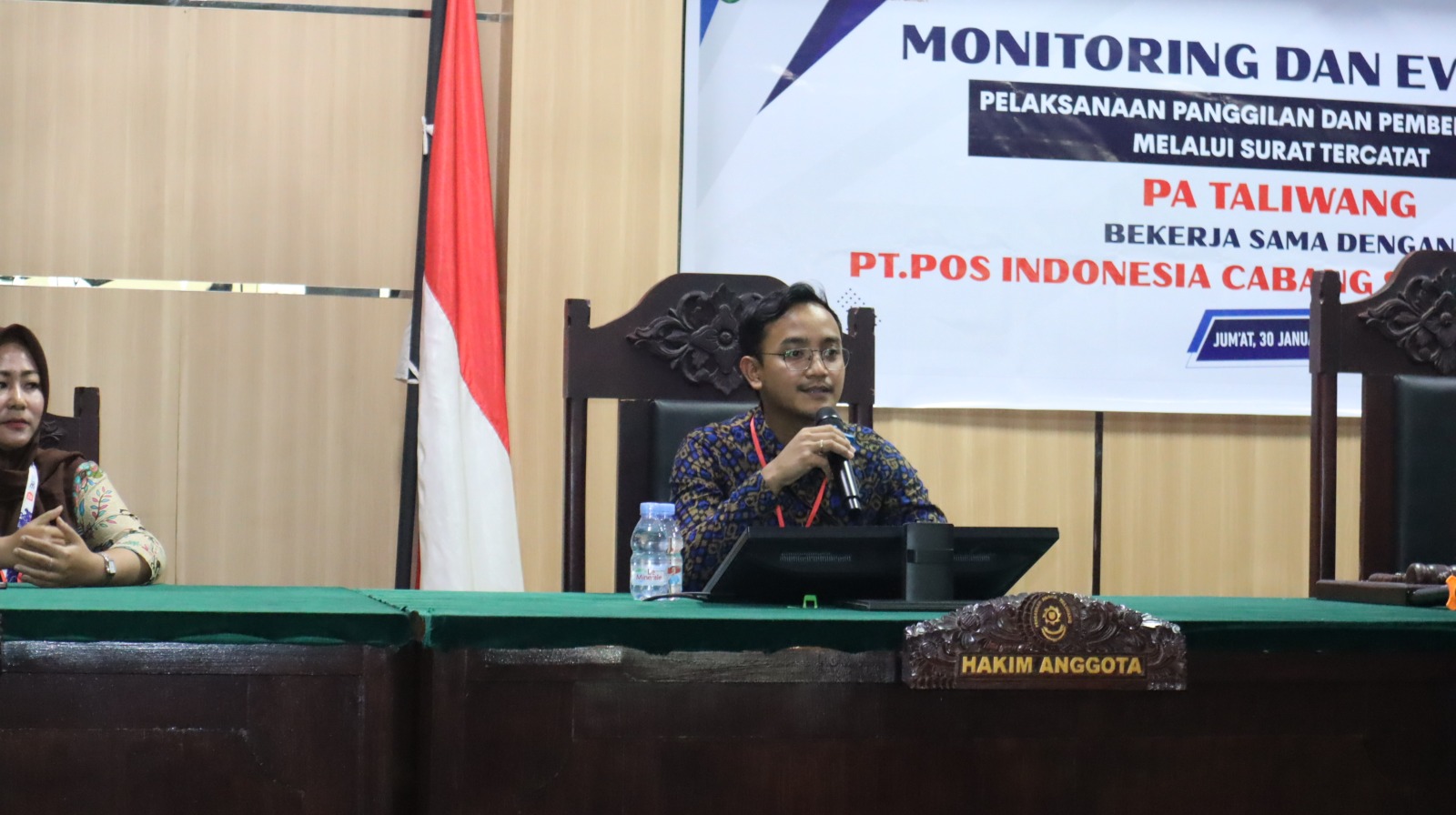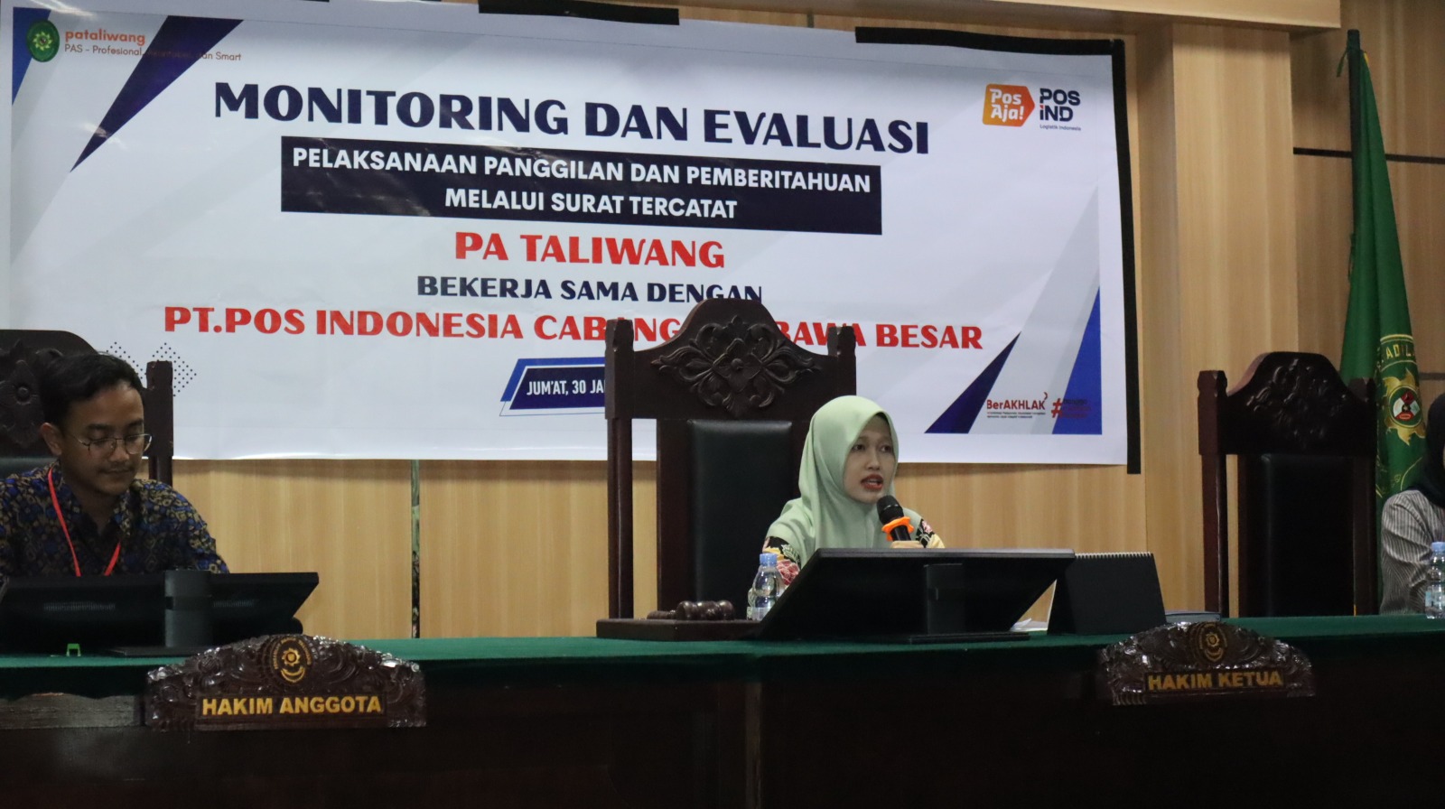 Taliwang | 30 Januari 2026 – Pengadilan Agama Taliwang melaksanakan Rapat Monitoring dan Evaluasi Pelaksanaan Panggilan dan Pemberitahuan melalui Surat Tercatat bekerja sama dengan PT. Pos Indonesia Cabang Sumbawa Besar. Kegiatan ini dilaksanakan pada pukul 09.00 WITA bertempat di Ruang Sidang PA Taliwang.