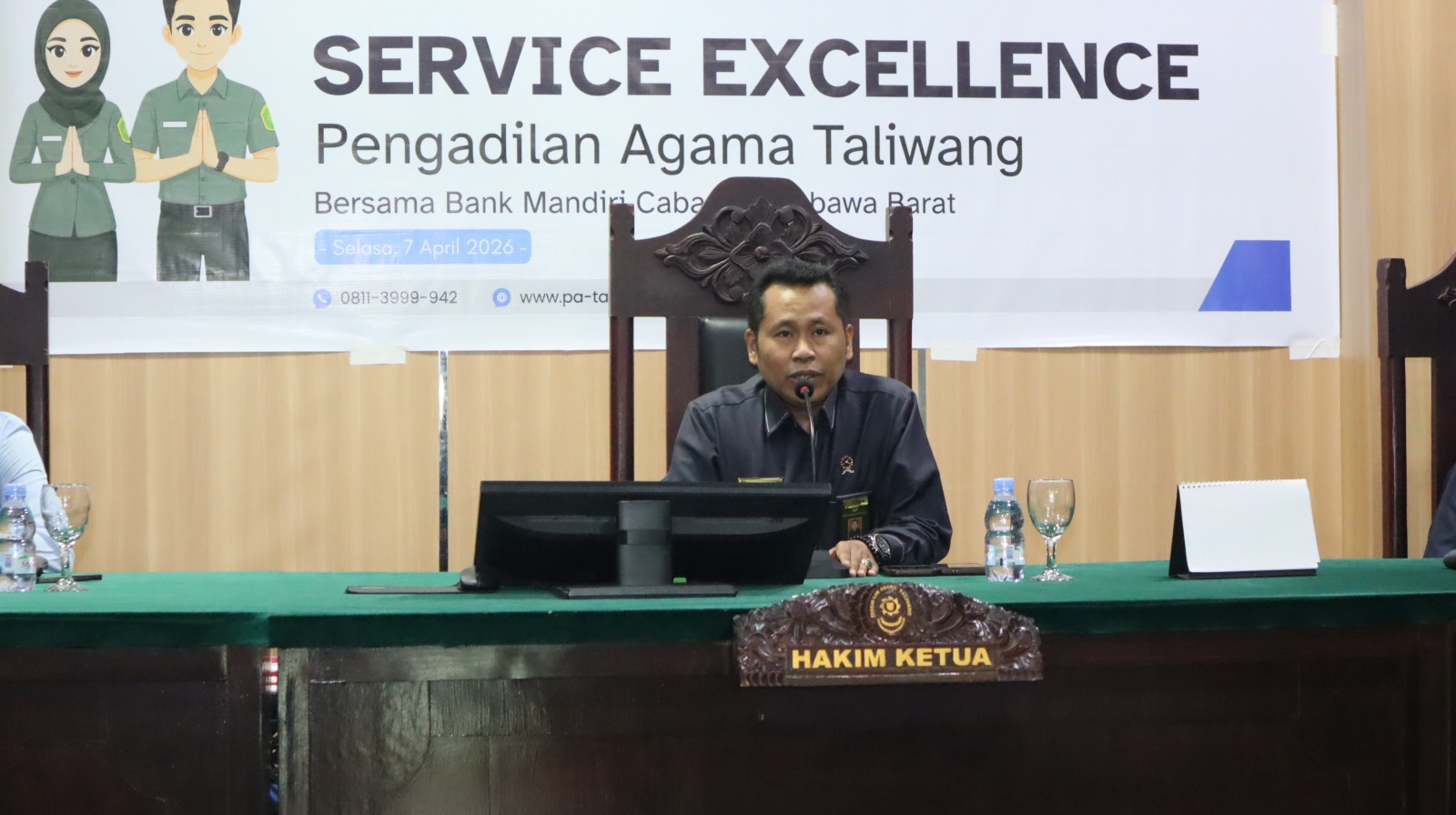 Pengadilan Agama (PA) Taliwang terus berbenah dalam memberikan pelayanan prima bagi masyarakat pencari keadilan. Sebagai wujud nyata komitmen tersebut, PA Taliwang menyelenggarakan kegiatan Sharing Session on Service Excellence. Kegiatan yang berlangsung di ruang sidang utama ini menghadirkan narasumber berkompeten, yakni Ady Suharyanto yang menjabat sebagai Kepala Bank Mandiri Cabang Taliwang.