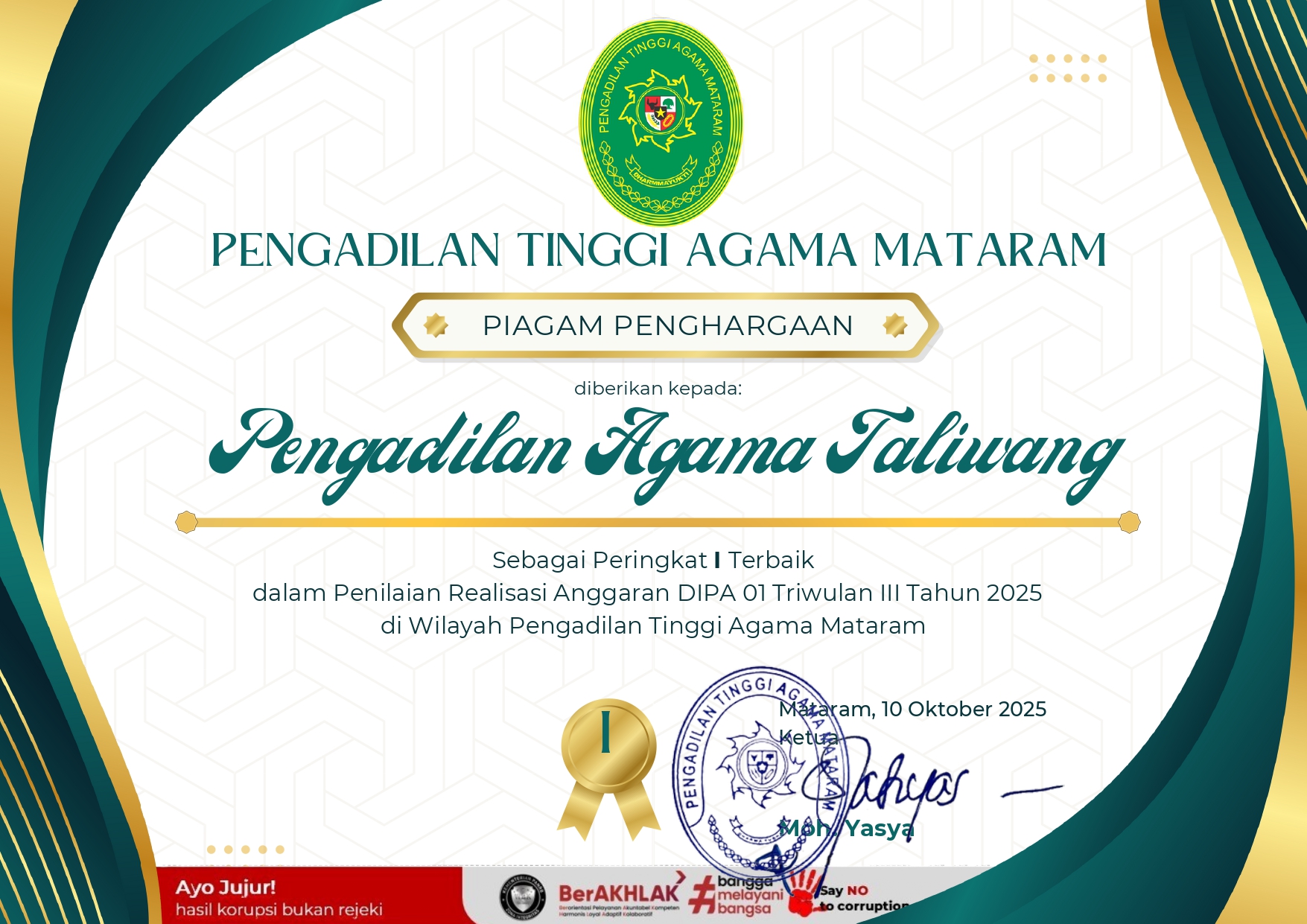 Taliwang – 14 Oktober 2025, Pengadilan Agama Taliwang kembali menorehkan prestasi gemilang di tingkat wilayah. Dalam ajang pemberian penghargaan yang diselenggarakan oleh Pengadilan Tinggi Agama Mataram, PA Taliwang berhasil meraih 7 (tujuh) penghargaan atas capaian kinerja selama tahun berjalan.