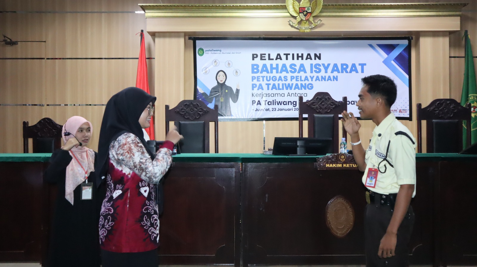 Taliwang – Pengadilan Agama Taliwang menyelenggarakan Pelatihan Bahasa Isyarat bagi petugas pelayanan sebagai upaya meningkatkan kualitas layanan publik yang ramah dan inklusif, khususnya bagi penyandang disabilitas. Kegiatan ini merupakan tindak lanjut dari Nota Kesepahaman (MoU) yang telah terjalin antara Pengadilan Agama Taliwang dengan SLBN 1 Sumbawa Barat.