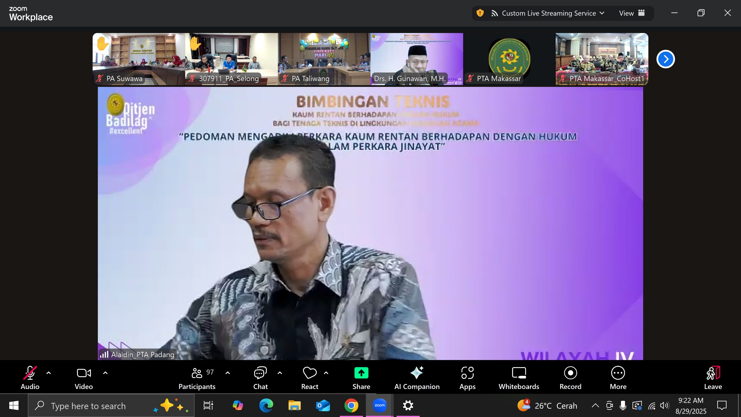 Taliwang, 29 Agustus 2025 – Pengadilan Agama Taliwang mengikuti Bimbingan Teknis (Bimtek) Daring Kaum Rentan Berhadapan dengan Hukum bagi Tenaga Teknis di Lingkungan Peradilan Agama Tahun 2025, dengan mengusung tema "Pedoman Mengadili Perkara Kaum Rentan Berhadapan dengan Hukum dalam Perkara Jinayat". Kegiatan ini dilaksanakan secara daring dan terpusat dari Ruang Media Center Pengadilan Agama Taliwang pada hari Jumat, 29 Agustus 2025, pukul 09.00 WITA.